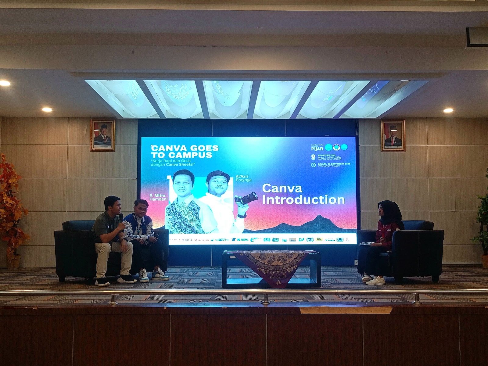 Acara dimulai dengan sesi talkshow oleh R. Mitra Hamdani, Duta Canva 2025 dan Al’Azri Prayoga, seorang konten kreator. Mitra menyampaikan bahwa dengan fitur-fitur terbaru, kini Canva bukan hanya soal desain. “Canva sudah bermitra dengan ratusan aplikasi untuk mempermudah pengguna, seperti Canva Sheets dan fitur AI,” ungkapnya.