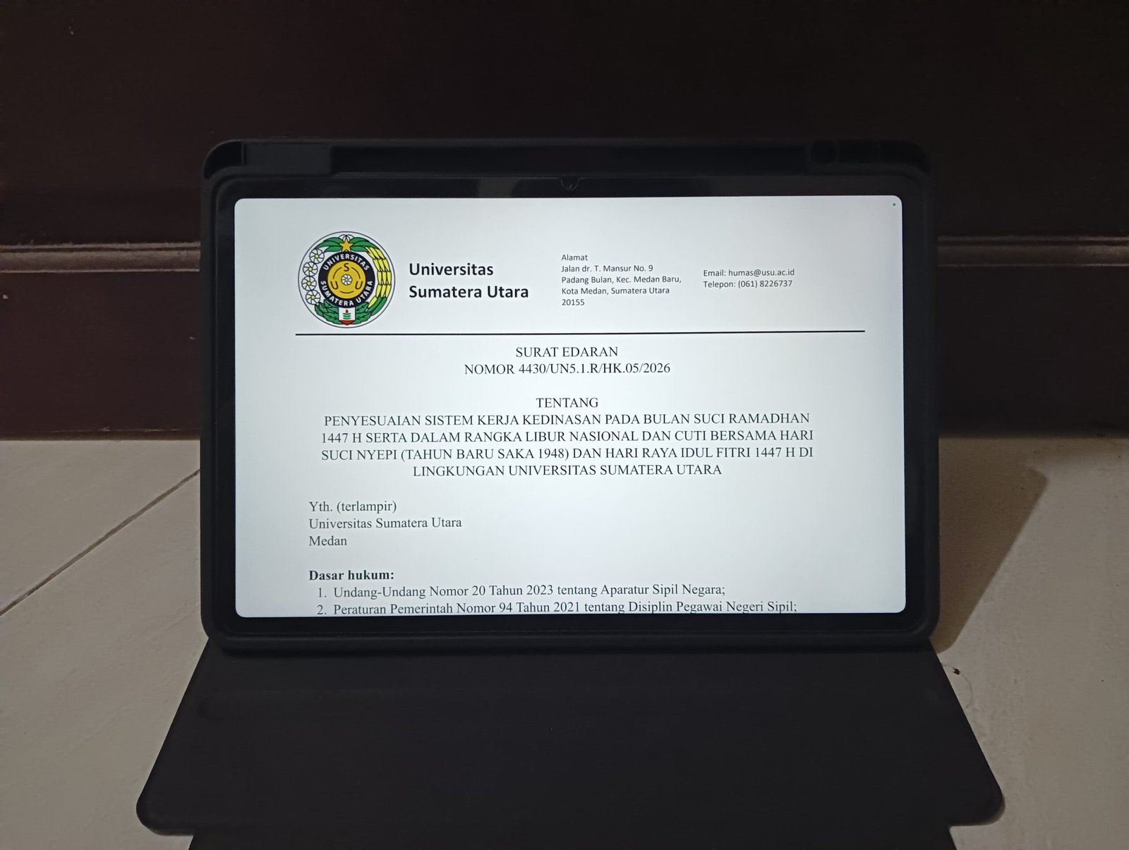 USU, wacana.org – Universitas Sumatera Utara (USU) telah menetapkan penyesuaian jam kerja dan perkuliahan selama bulan Ramadan. Kebijakan tersebut tertuang dalam Surat Edaran (SE) Rektor Nomor 4430/UN5.1.R/HK.05/2026 yang telah disampaikan kepada masing-masing fakultas. Hal ini dikonfirmasi oleh Direktur Pengembangan Pendidikan USU, Ikhsan Siregar, Rabu (18/2/2026).