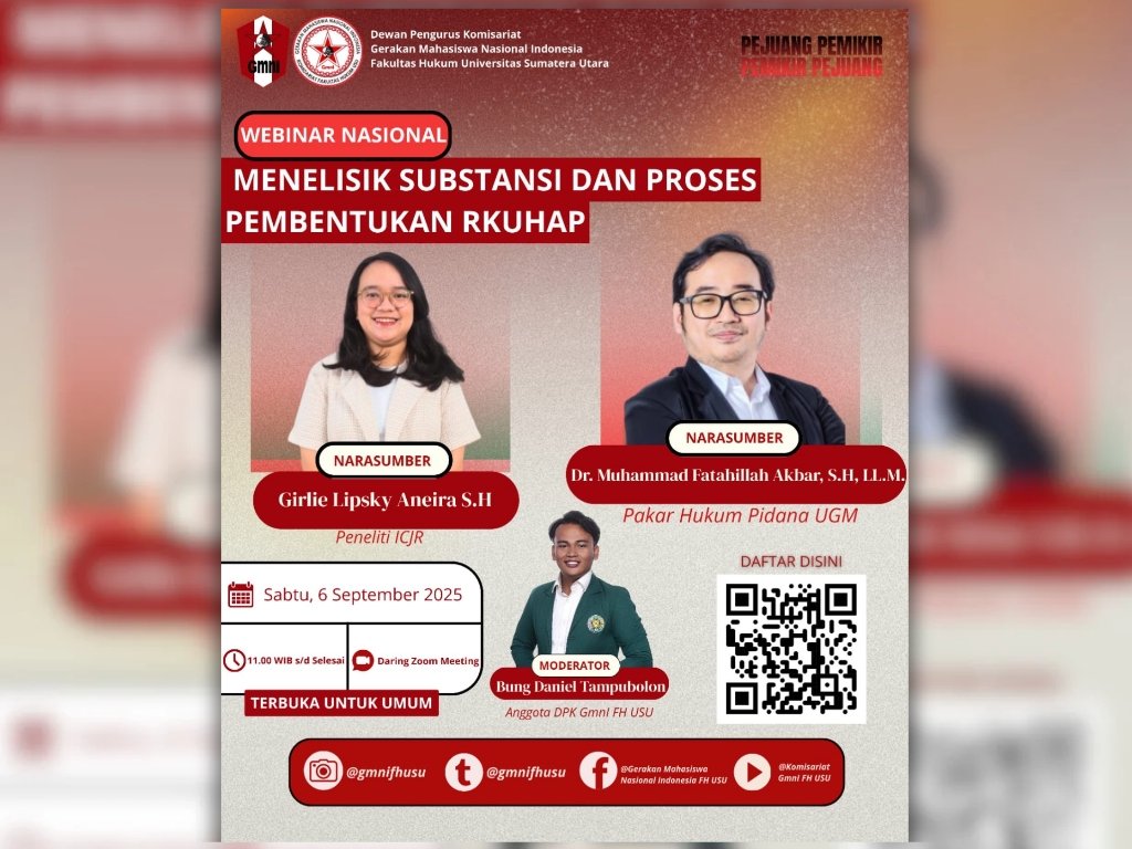 Flyer Webinar Nasional “Menelisik Substansi dan Proses Pembentukan RKUHAP” yang diadakan oleh DPK GMNI FH USU, Sabtu (6/9/2025). | Sumber Istimewa