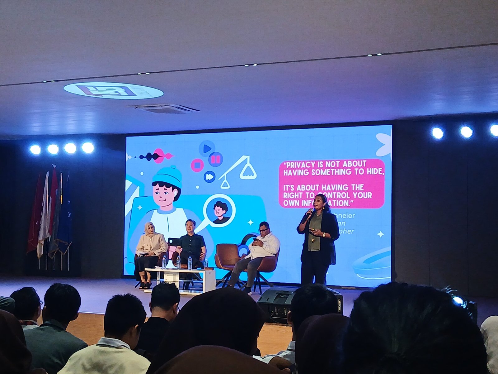 Salah satu pemateri, Hendra, menyampaikan bahwa perkembangan teknologi Artificial Intelligence (AI) membuktikan adanya pemalsuan dalam bentuk video yang disebut deepfake. “Praktik penipuan atau scam tidak dilakukan melalui serangan teknologi semata, melainkan dengan memanfaatkan kelemahan psikologis manusia,” ujarnya.