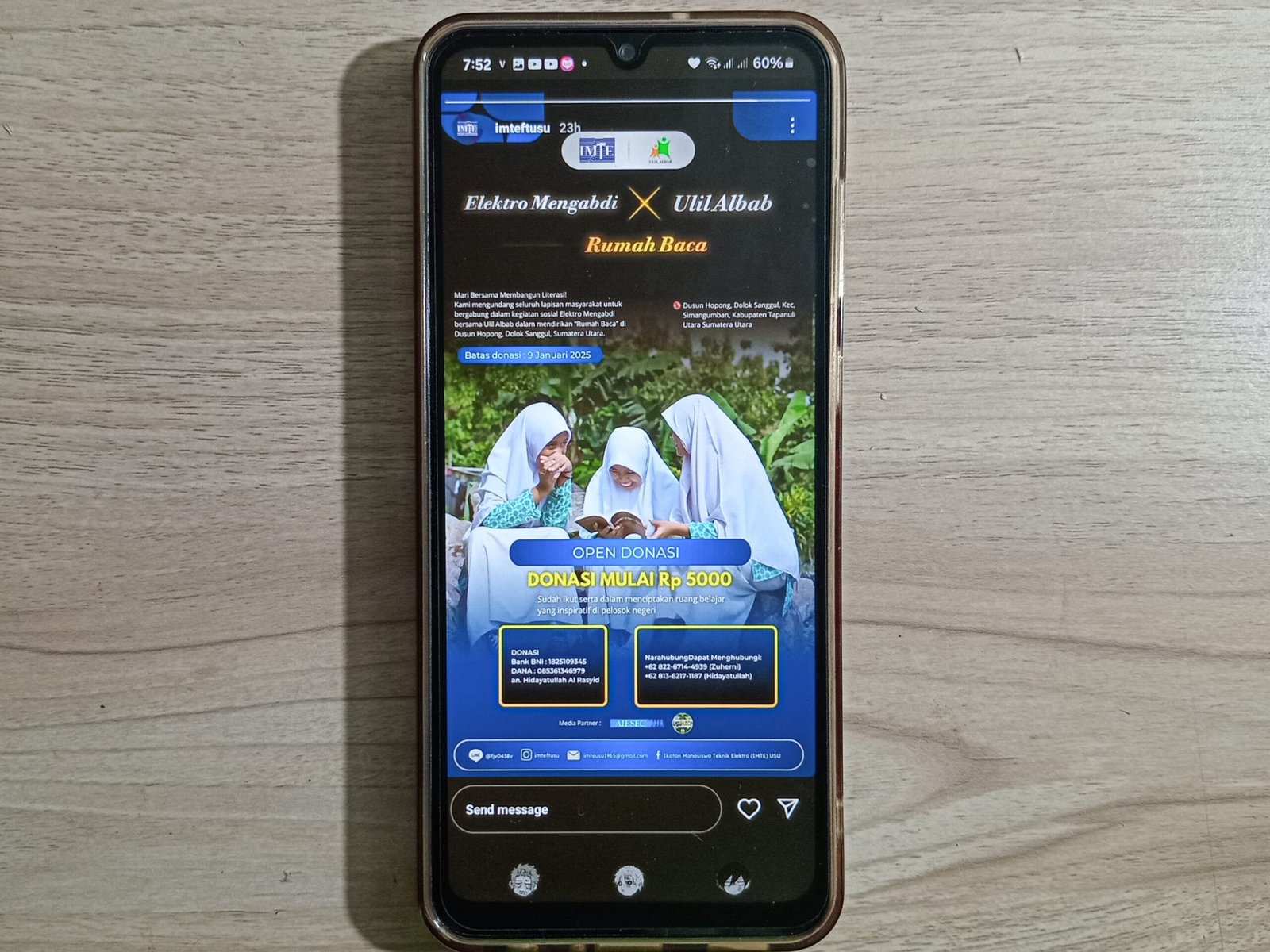 USU, wacana.org — Ikatan Mahasiswa Teknik Elektro (IMTE) Fakultas Teknik (FT) Universitas Sumatera Utara (USU) membuka donasi buku untuk masyarakat di Desa Hopong, Dolok Sanggul, Kecamatan Simangumban, Kabupaten Tapanuli Utara. Program donasi ini dibuka hingga tanggal 09 Januari 2025 untuk mahasiswa dan masyarakat umum. Hal ini disampaikan oleh Sekretaris Umum IMTE, Zuherni Syuhada, Minggu (05/01/2025).