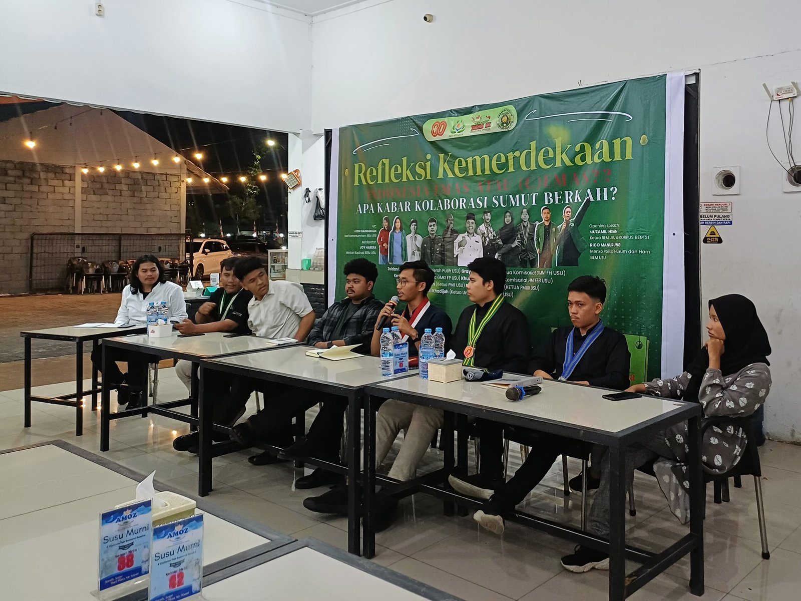 Diskusi yang dimoderatori Joy Harefa, Menteri Kajian Strategis (Kastrat) BEM USU menghadirkan pemantik dari berbagai elemen mahasiswa yaitu, Zaidan Lubis (Ketua KAMMI Merah Putih USU), Gray Sembiring (Ketua Komisariat GMNI FH USU), Kevin Simanjuntak (Ketua GMKI FP USU), Khubaib Azka (Ketua Komisariat HMI FEB USU). Serta, Jalaludin Pulungan (Ketua PMII USU), Nicola Simarmata (Ketua PMKRI USU), dan Siti Khadijah (Ketua Umum IMM Soshum USU).