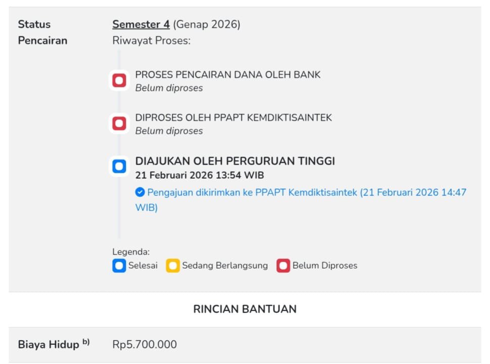 USU, wacana.org – Status pencairan Kartu Indonesia Pintar Kuliah (KIP-K) Universitas Sumatera Utara (USU) memasuki tahap pengajuan pada 21 Februari 2026 ke Pusat Pembiayaan dan Asesmen Pendidikan Tinggi (PPAPT) Kemdiktisaintek. Hal ini disampaikan langsung oleh Kepala Subbagian (Kasubbag) Kesejahteraan Mahasiswa USU, Reno Pumadiansyah, Jumat (20/2/2026).