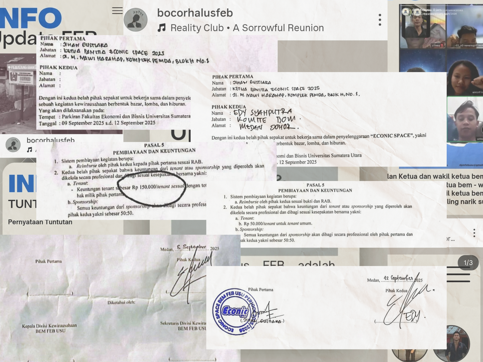 Berdasarkan keterangan yang dihimpun, ia menyebutkan terdapat enam pihak yang diduga terlibat, yakni Axel Byron Sinaga (Ketua BEM FEB), Angga Al Ma’aris Harahap (Wakil Ketua BEM FEB), Isqi Wiguna (Kepala Divisi Kewirausahaan), Cut Tari Shavira (Sekretaris Divisi Kewirausahaan), Johandi Rafael (Koordinator Eksternal), dan Jihan Gustiara (Ketua Panitia).