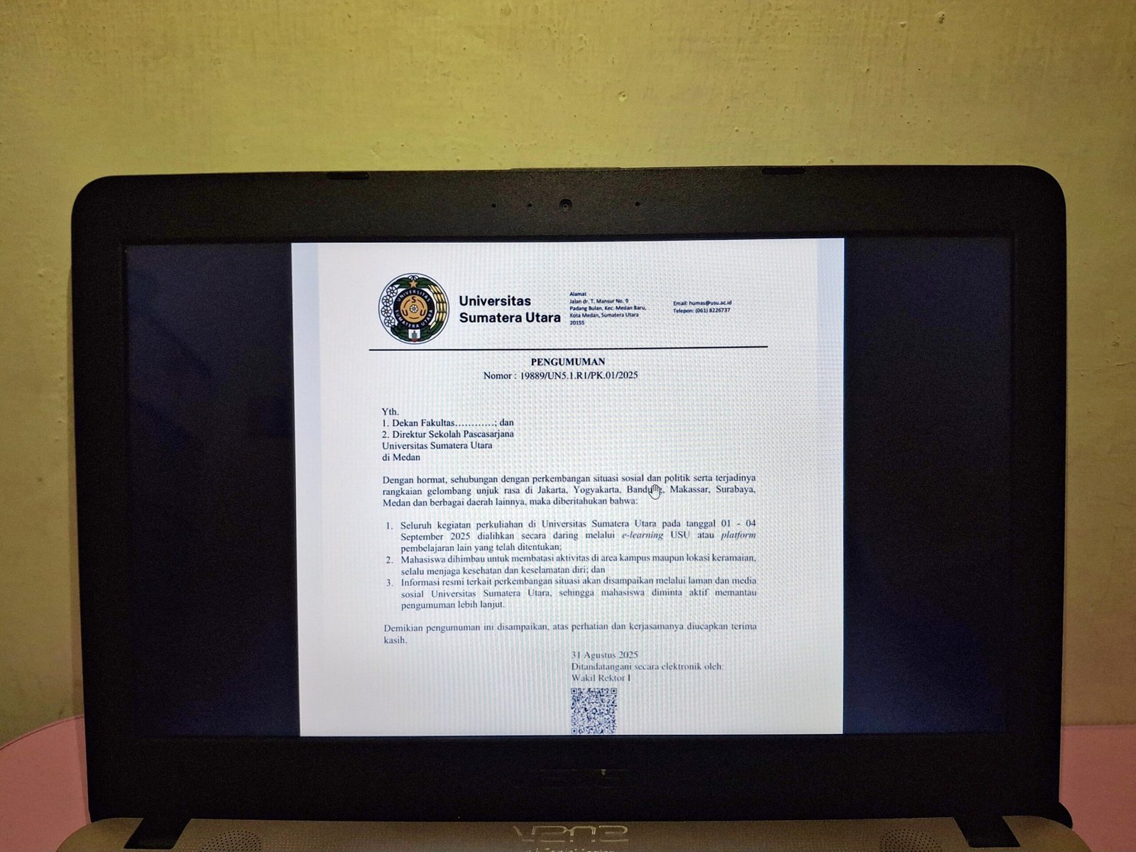 USU, wacana.org – Universitas Sumatera Utara (USU) mengumumkan bahwa seluruh kegiatan perkuliahan dialihkan menjadi daring mulai tanggal 1–4 September 2025. Hal ini disampaikan melalui surat edaran bernomor 19889/UN5.1.R1/PK.01/2025 yang ditandatangani oleh Wakil Rektor I, Edy Ikhsan, Minggu (31/8/2025).