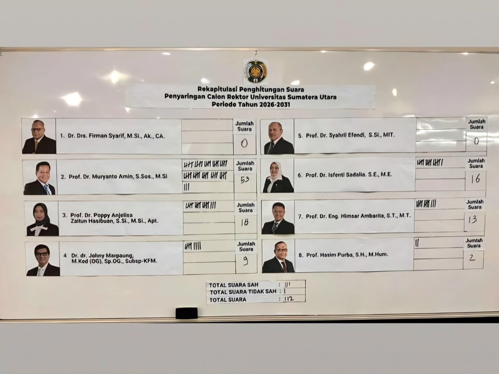 USU, wacana.org – Universitas Sumatera Utara (USU) telah melaksanakan penyaringan calon rektor periode 2026–2031 di Ruang Senat Akademik, Biro Rektor USU pada 25 September 2025. Dari delapan kandidat calon, Muryanto Amin memperoleh suara terbanyak dengan total 53 suara dari 117 suara sah.